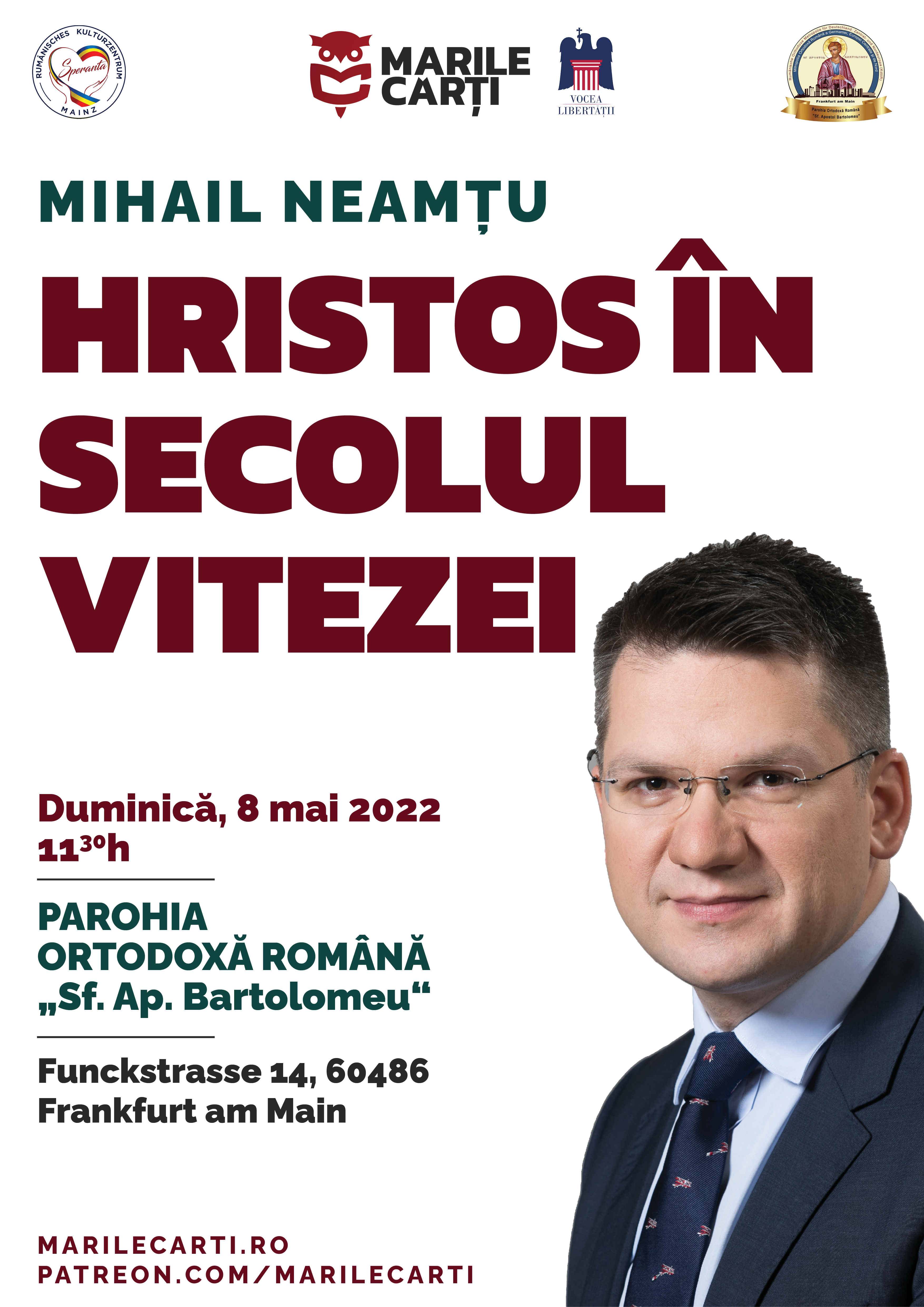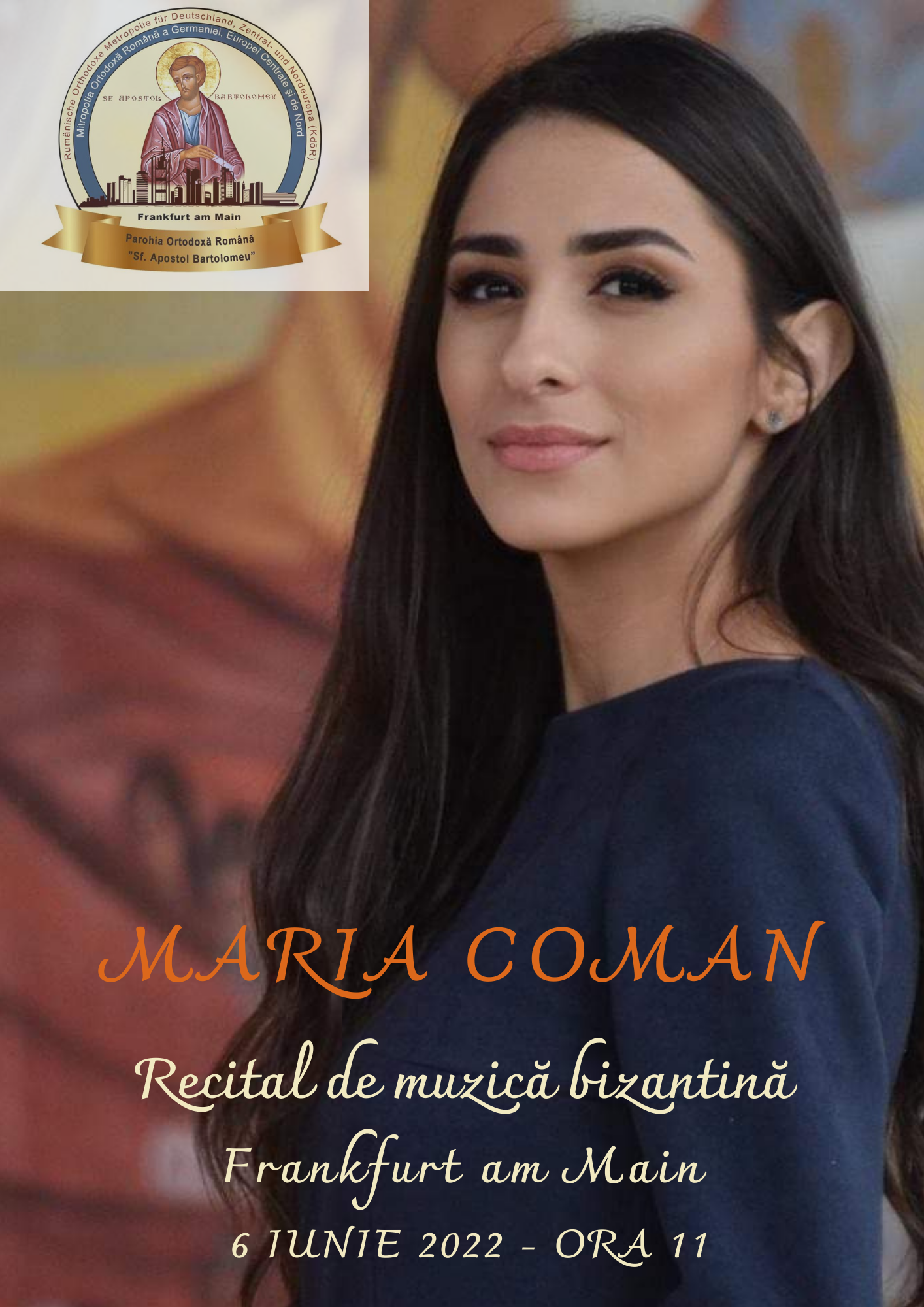Parohia "Sf. Ap. Bartolomeu" Frankfurt am Main are bucuria de a vă invita la sărbătoarea hramului. Sărbătoarea hramului a fost stabilită pentru luni, 6 iunie 2022, începând cu ora 8:30 cu Utrenia și Sfânta Liturghie într-un frumos sobor de preoți. Parohia noastră a invitat, la bucuria noastră, pe doamna Maria Coman, cunoscută cântăreață de muzică bisericească. O binecuvântare pentru noi să putem ascultă live glasul doamnei Coman.