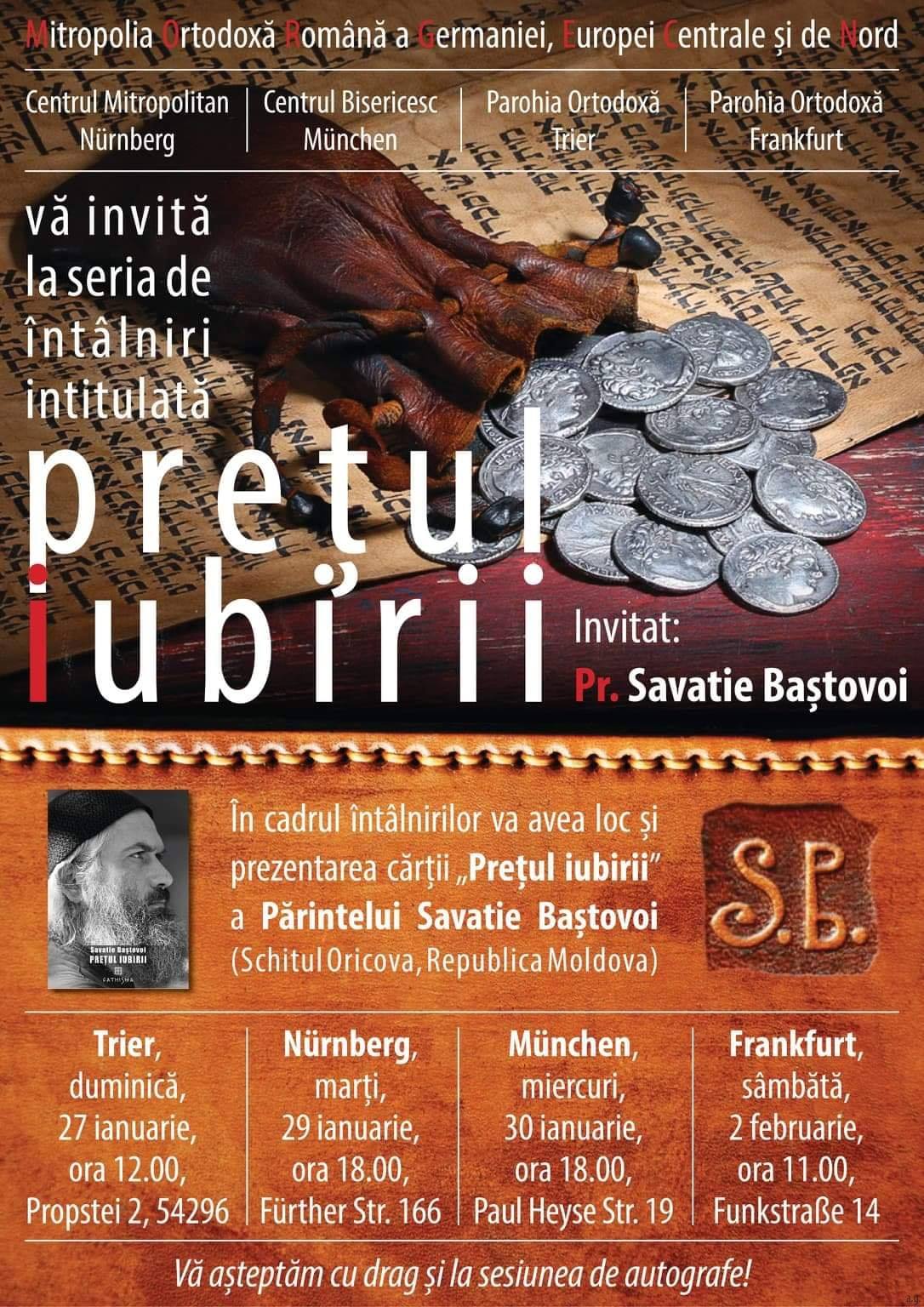 Sâmbătă 15 decembrie și duminică 16 decembrie 2018 parohia noastră sărbătorește doi ani de la prima Sfântă Liturghie în Parohia „Sf. Ap. Bartolomeu” din Frankfurt am Main. La sărbătoarea noastră va fi prezent Preasfințitul Părinte Dr. Sofian Brașoveanul, Episcop Vicar al Arhiepiscopiei Germaniei, Austriei și Luxemburgului. Preasfinția Sa va sluji în parohia noastră Taina Sfântului Maslu, va întreține o seară duhovnicească și va sluji la Sfânta Liturghie Arhierească.