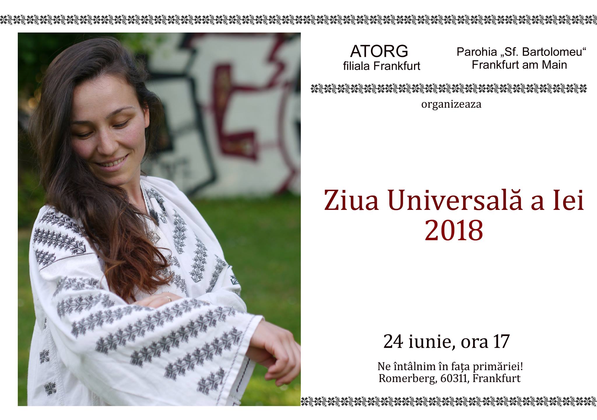 ATORG Filiala Frankfurt am Main și Parohia „Sfântul Apostol Bartolomeu” Frankfurt am Main vă invită să ne alăturăm și noi comunităţilor româneşti din peste 100 de oraşe, din 48 de ţări si sărbătorim cu bucurie Ziua universală a Iei. Fie că locuiești in Frankfurt sau ești în trecere, vino alături de noi și fi un ambasador al frumosului și al Romaniei. Îmbracă ia neamului tău sau o camașă/ tricou alb și nu uita că azi sunt Sînzienele și-ți poți împodobi părul cu flori sau cu o coroniță. Ne vedem la 17:00 în fața primăriei! (Römerberg 27, Frankfurt am Main)