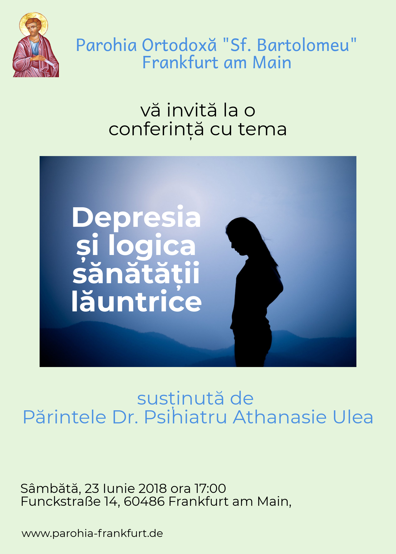 Parohia „Sfântul Apostol Bartolomeu” Frankfurt am Main vă invită sâmbătă, 23 iunie 2018 ora 17, la Conferința cu tema „Depresia și logica sănătății lăuntrice” susținută de părintele Athanasie (Alexandru) Ulea de la Parohia Chemnitz. Părintele Athanasie este medic psihiatru. Tema propusă este o temă care preocupă din ce în ce mai des societatea germană și nu numai, deseori această boală este întâlnită și în rândul românilor plecați de acasă pentru a găsi un trai mai bun.