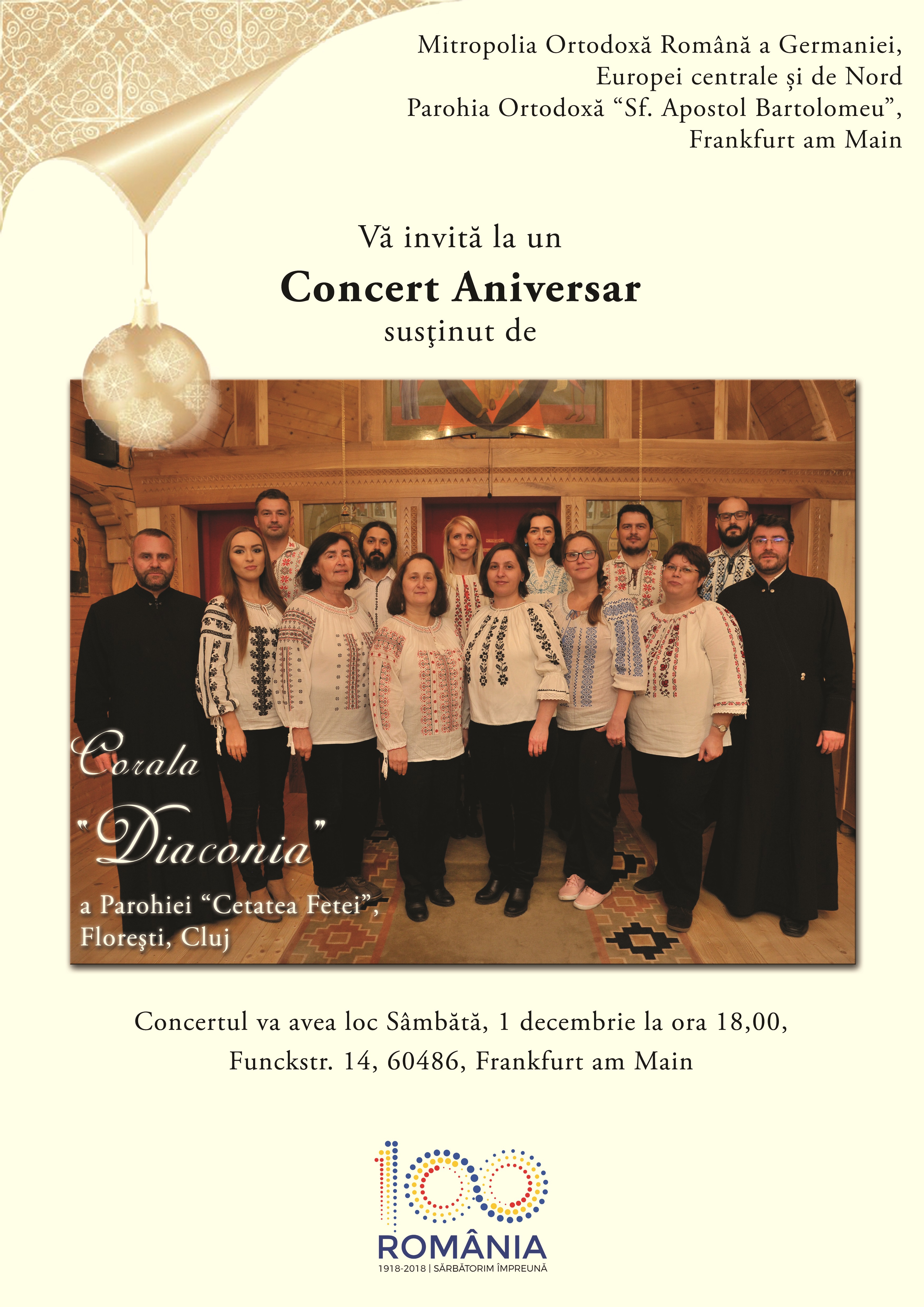 Parohia Ortodoxă „Sf. Bartolomeu” din Frankfurt am Main are bucuria să vă invite, sâmbătă 1 decembrie 2018 ora 18, la „Concert de colinde și muzică patriotică România 100”. Concertul va fi susținut de Corala DIACONIA din Cetatea fetei, Florești, județul Cluj. Prețul biletului de intrare este 10 euro și este destinat exclusiv acoperiri cheltuielilor de deplasare a coralei formată din 10 membri. Copii sub 10 ani nu plătesc.