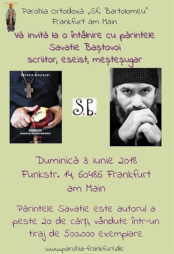 Duminica a treia din Postul Mare numită și Duminica Sfinte Cruci, ne aduce bucuria de a avea din nou în mijlocul nostru pe Preasfințitul Părinte Dr. Sofian Brașoveanul, Episcop Vicar al Arhiepiscopiei Germaniei, Austriei și Luxemburgului. Preasfințitul Sofian va sluji la noi sâmbătă seara, 10 martie 2018 de la ora 18, Taina Sfântului Maslu și duminică dimineața Sfânta Liturghie Arhierească și va predica. După Sfânta Liturghie vom pleca împreună în pelerinajul anual de la Limburg. Amănunte despre acest pelerinaj găsiți în articolul de pe site-ul nostru aici.