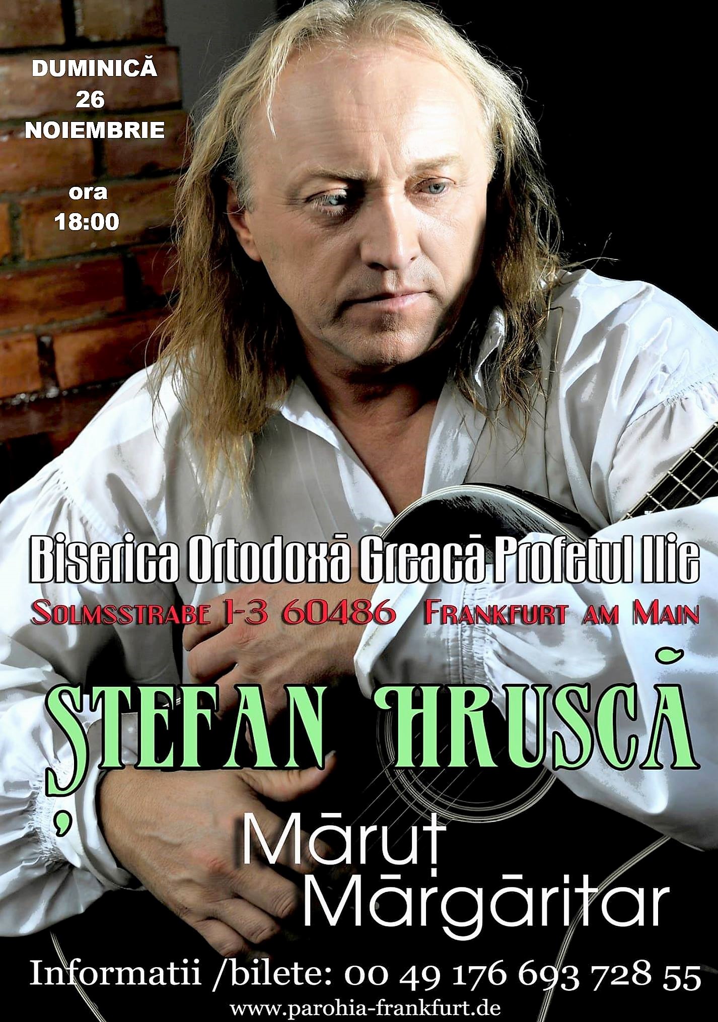 Parohia Ortodoxă Română „Sfântul Apostol Bartolomeu” din Frankfurt am Main are bucuria și privilegiul să vă prezinte un concert de excepție la Frankfurt. Maestrul Ștefan Hrușcă vine să ne încânte inimile în 26 noiembrie 2017 începând cu ora 18 la Biserica Ortodoxă Greacă „Profetul Ilie” pe Solmsstr. 1-3, 60486 Frankfurt am Main.